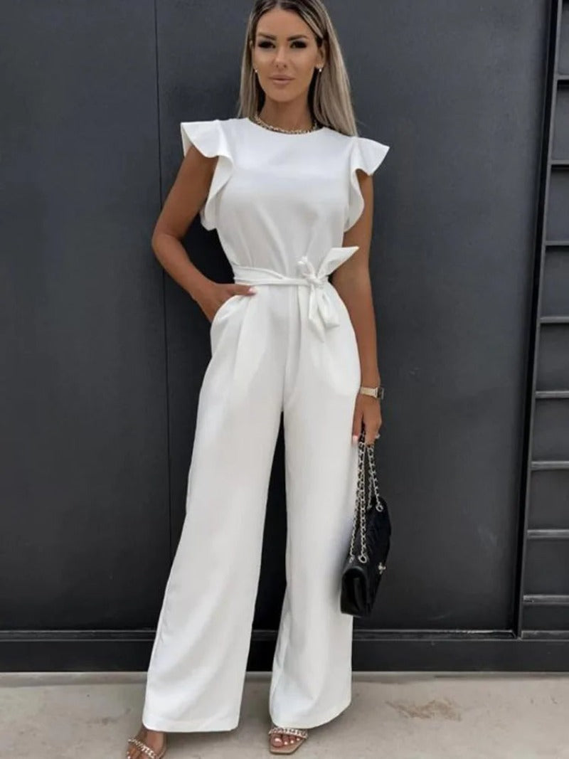 Adoptez la sophistication avec notre élégante combinaison blanche pour femme à manches papillon. Cette combinaison unie et décontractée à col rond possède des jambes larges et une ceinture flatteuse, ce qui la rend parfaite pour l'été et le bureau. Les manches papillon ajoutent une touche de féminité et d'élégance.