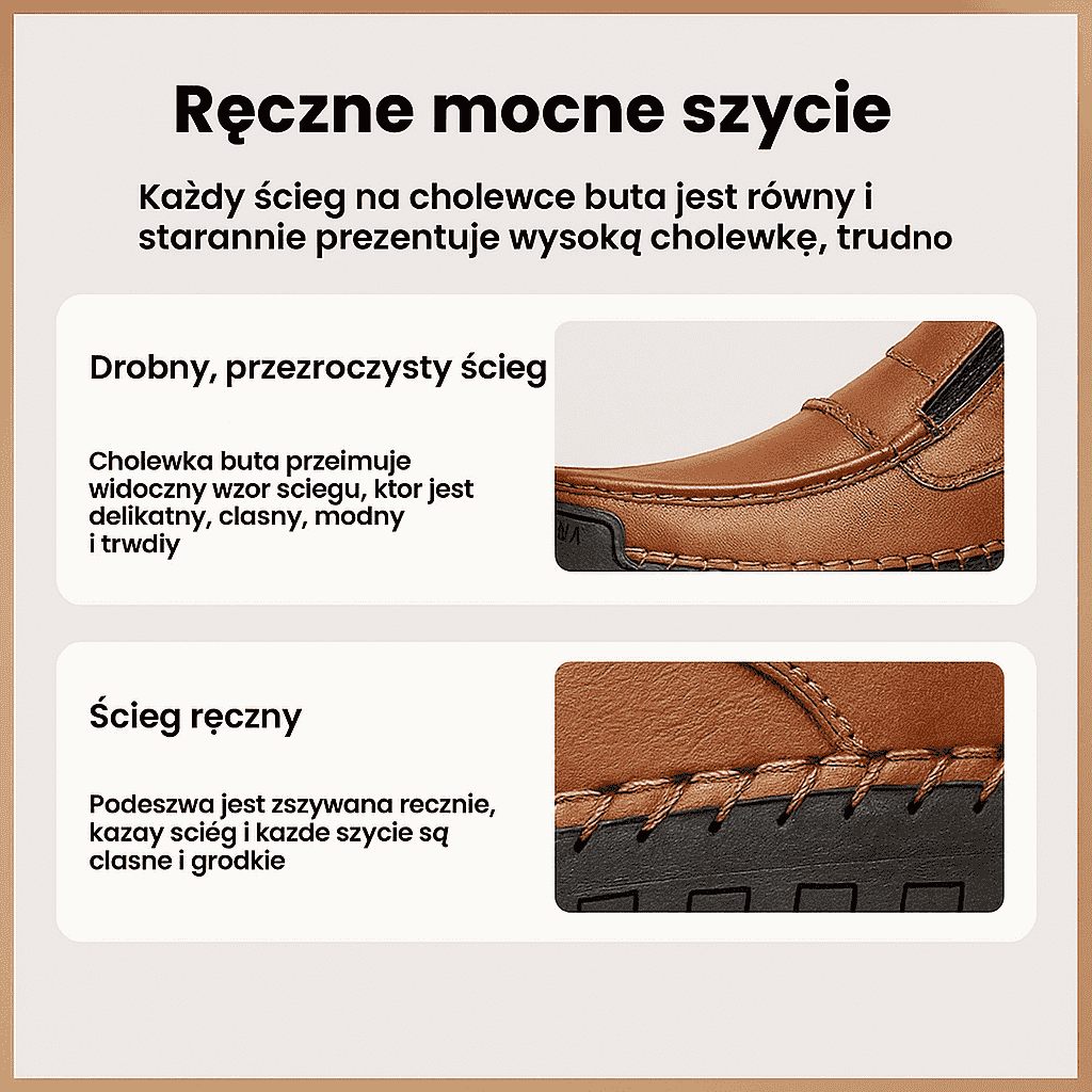 Starannie szyte ręcznie z wysokogatunkowej skóry, zapewniają wyjątkową trwałość, bogatą fakturę i ponadczasowe rzemiosło. Boczne zapięcie na suwak oraz regulowany pasek umożliwiają szybkie zakładanie i zdejmowanie, gwarantując jednocześnie pewne i wygodne dopasowanie przez cały dzień.