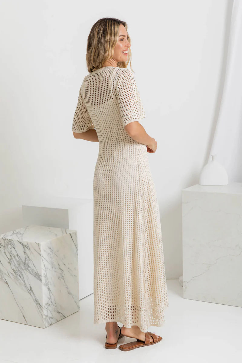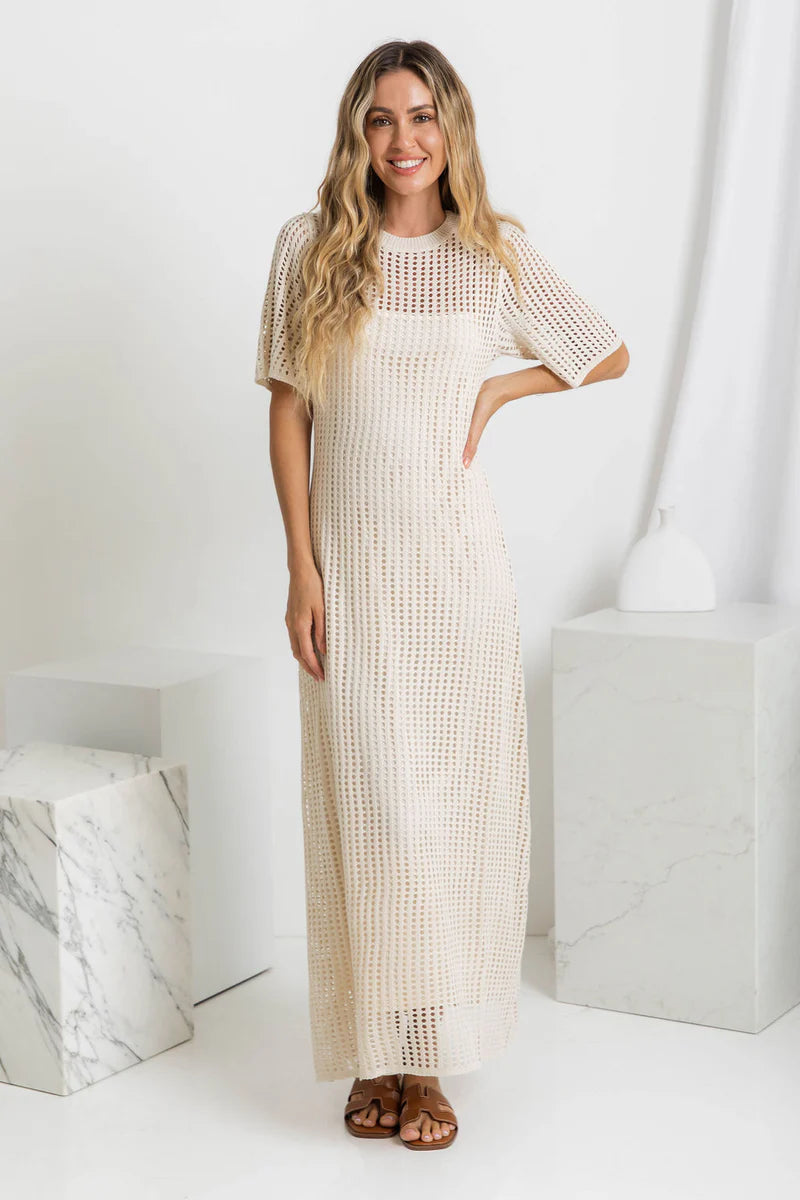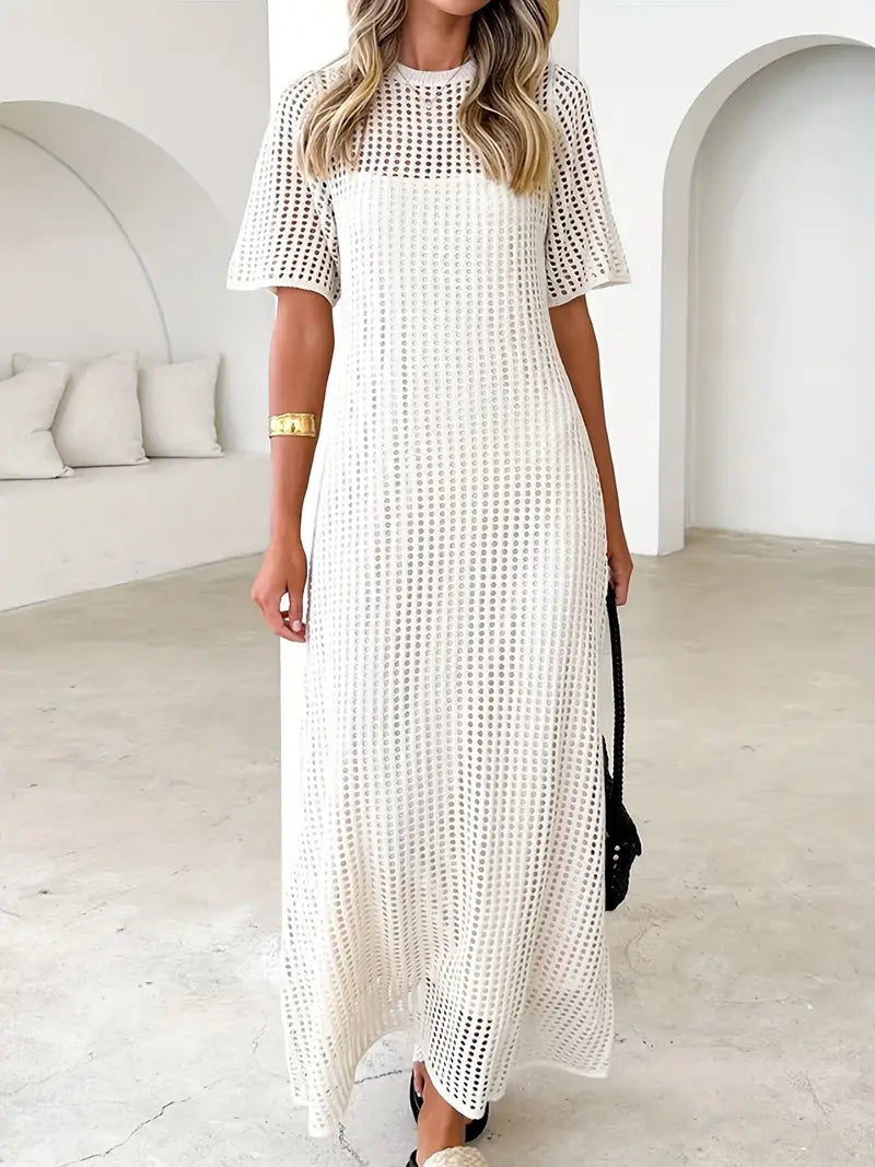 Ażurowa sukienka z krótkim rękawem zachwyca subtelnymi wycięciami, które tworzą efektowną fakturę. Jej luźny krój zapewnia swobodę ruchów i komfort w cieplejsze dni, a jednocześnie pięknie układa się na ciele. Idealna na wakacyjne spacery, spotkania z przyjaciółmi czy popołudniową kawę w mieście.