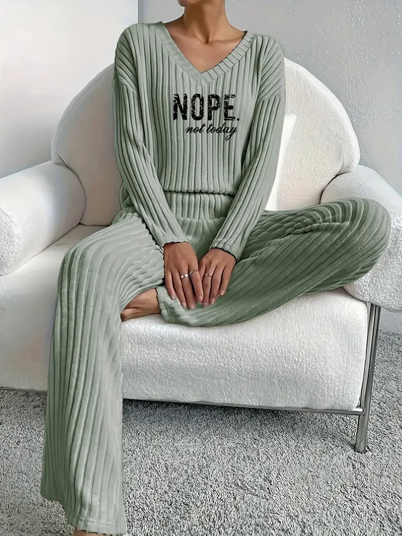 Cet ensemble deux pièces côtelé se compose d'un haut à manches longues avec un col en V et des épaules tombantes, associé à un pantalon doté de poches et d'une taille élastique. Confortable et élégant, il est parfait pour un usage quotidien ou pour se détendre.