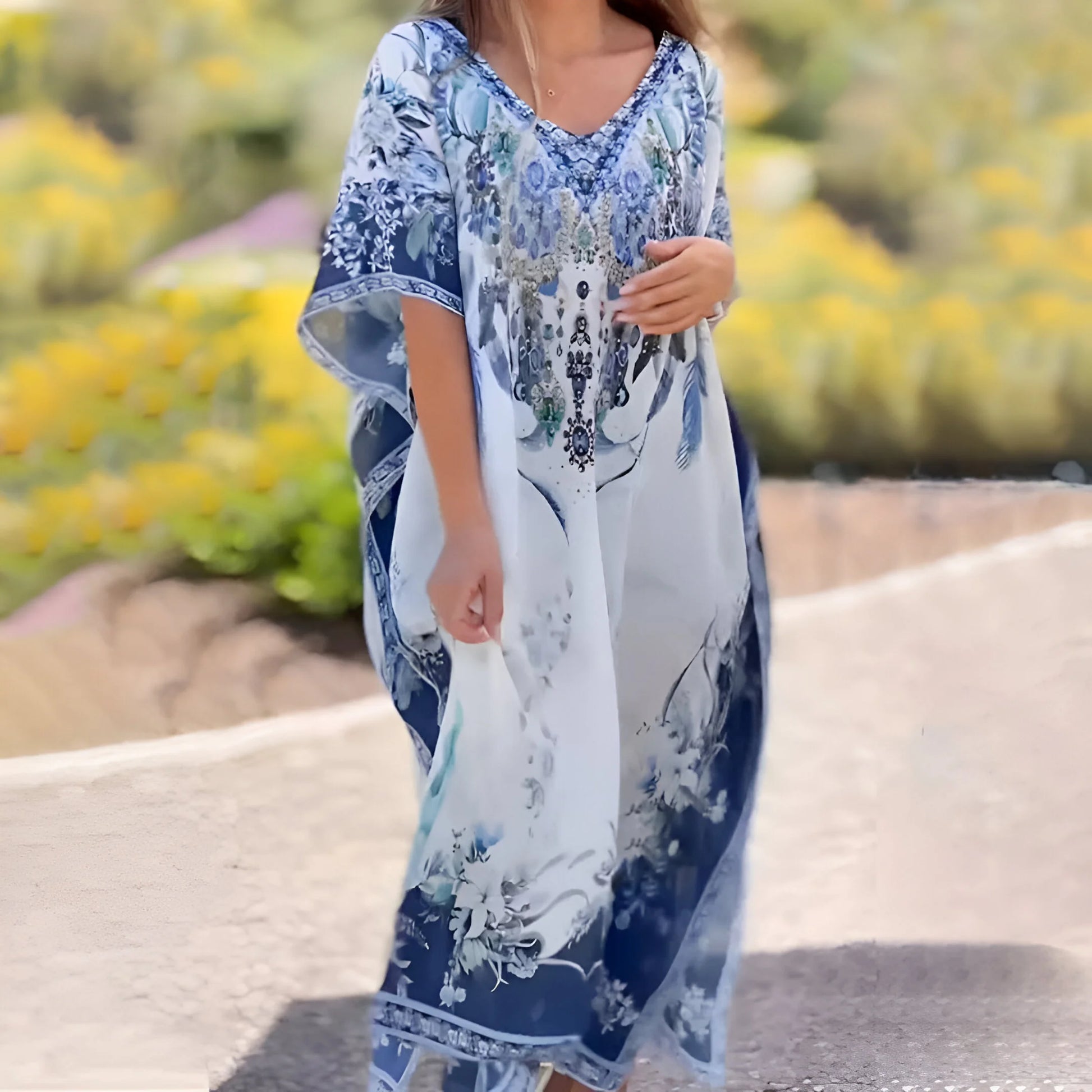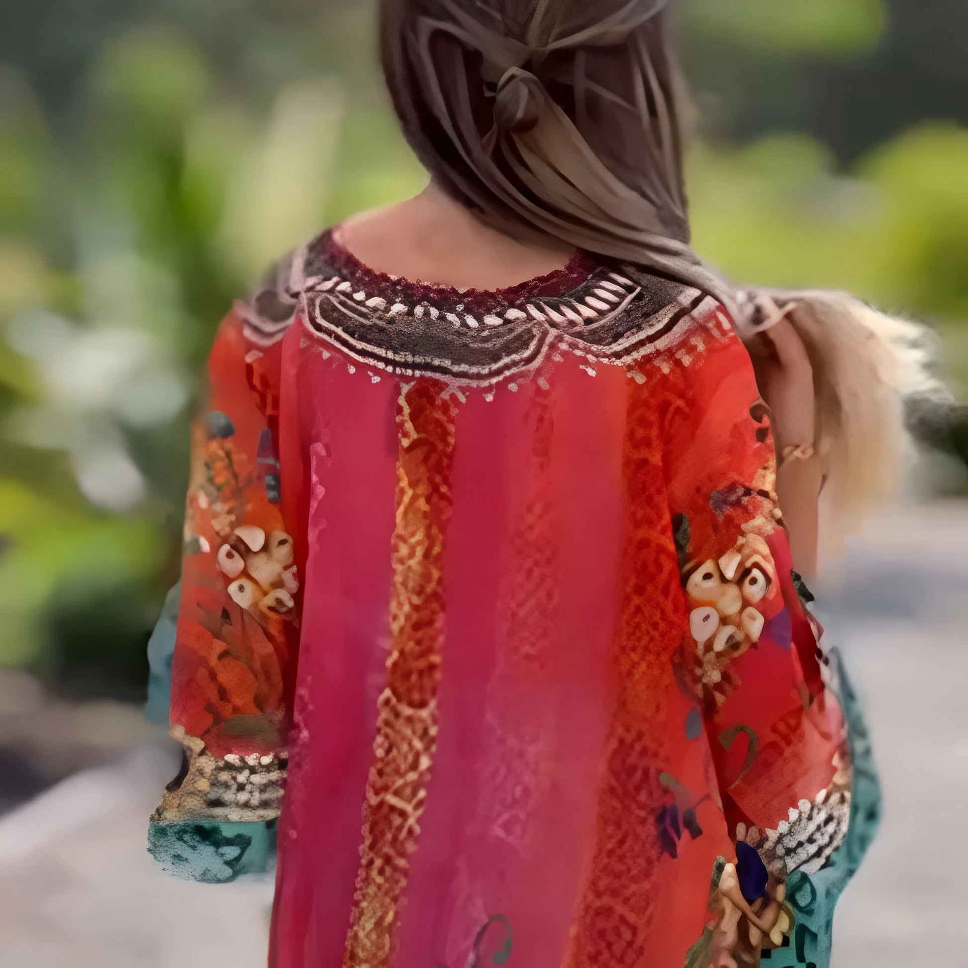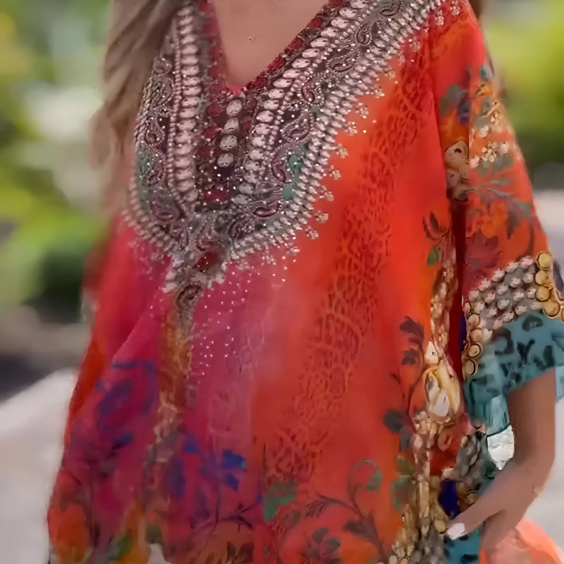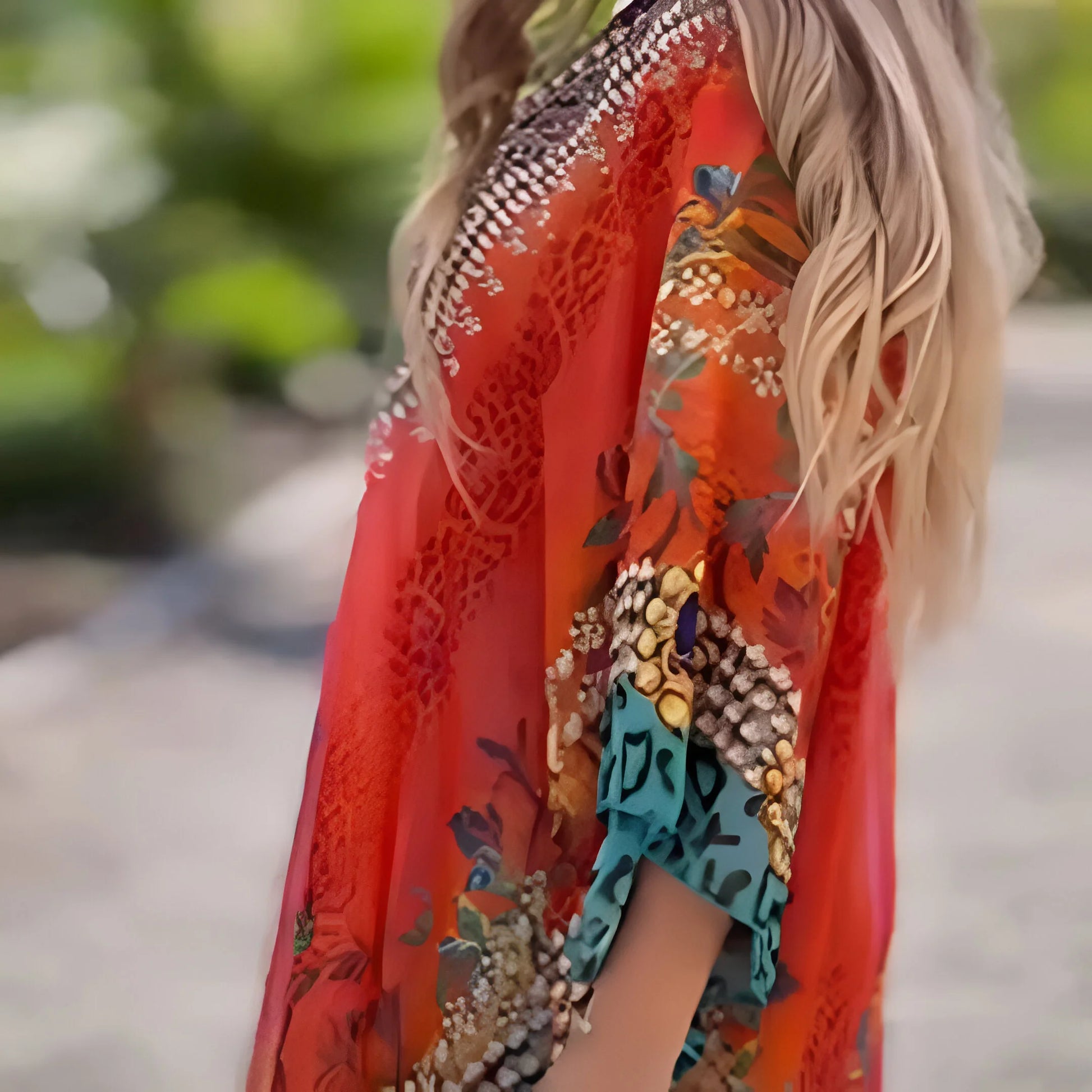 Cette robe asymétrique vibrante présente un col en V flatteur et une coupe décontractée pour une élégance estivale légère. Ses imprimés audacieux et sa silhouette fluide la rendent parfaite pour les journées à la plage ou les sorties décontractées.