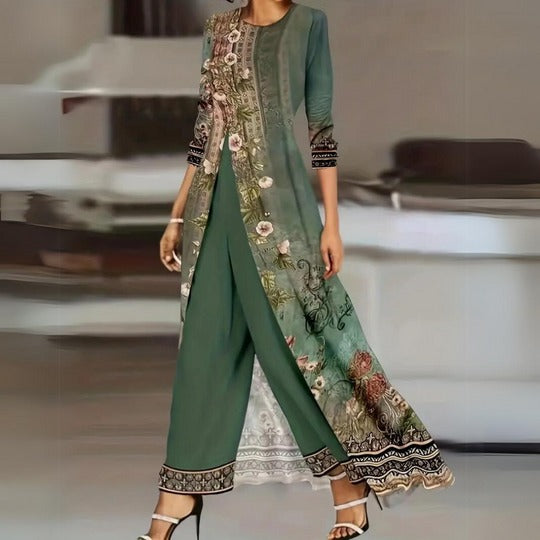 Découvrez le charme raffiné de notre ensemble haut fendu et pantalon assorti, un chef-d'œuvre de style et de confort. Cet ensemble associe un haut élégant aux détails artistiques à une silhouette fluide, parfaitement associée à un pantalon assorti.